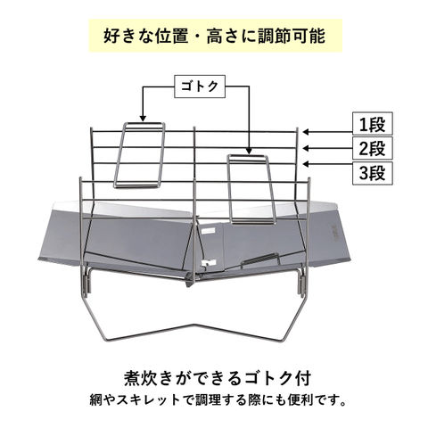 | 950gと軽量コンパクトな焚火台。 ソロキャンプやツーリングに最適。 ●横幅(約)41.5cm。40cmの薪が切らずに載せられる。 ●煮炊きができるゴトク付き。ゴトクは好きな位置にスライド可能。高さ3段階に調節可能。 ※ゴトク耐荷重/2kg(ゴトク1個につき1kg) ●薄型コンパクト収納 ●収納バッグ付き |