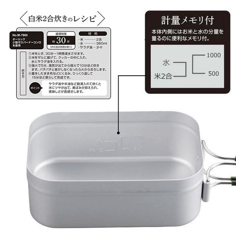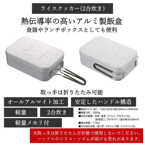 | 熱伝導性の高いアルミ製飯盒 2合炊きのライスクッカー。食器やランチボックスとしても便利です。コンパクトストーブや小型ガスバーナーでご飯を炊くことができます。取っ手は折りたたみ可能。 別売のロストルを使用すれば蒸し料理や燻製ができる 余分な脂がロストルの下に落ちヘルシーに。焦げ付きも防げます。 |
