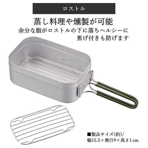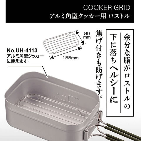 | 余分な脂がロストルの下に落ちヘルシーに。焦げ付きも防げる。蒸し料理や燻製を作るのに便利です。 アルミ角形クッカー(UH-4113)にピッタリサイズ。 |