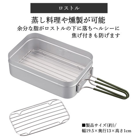 | 余分な脂がロストルの下に落ちヘルシーに。焦げ付きも防げる。蒸し料理や燻製を作るのに便利です。 アルミ角形クッカーL(UH-4115)にピッタリサイズ。 |