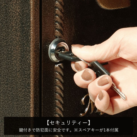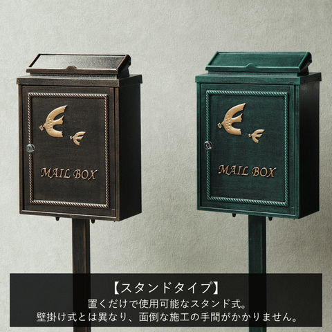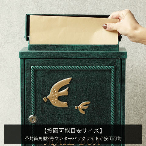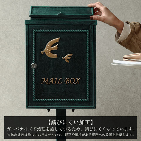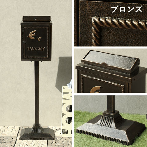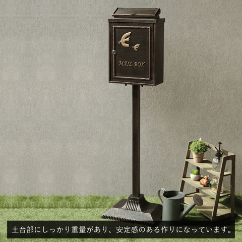 | 【スタンドタイプ】 置くだけで使用可能なスタンド式。壁掛け式とは異なり面倒な施工の手間がかかりません。 パーツは、郵便入れ本体、脚、台座の3つからなり、組立もシンプルで時間を多く費やさずに可能です。 【投函可能目安サイズ】 茶封筒角型2号が投函可能です。 【セキュリティー】 鍵付きなので防犯面に安心です。また、スペアキーが1本付属しています。 【錆びにくい加工】 ガルバナイズド処理を施している為、錆の発生がしにくい仕様となっております。 ※防水加工は施しておりませんので、軒下や屋根がある場所への設置を推奨致します。 【デザイン】 郵便取り出し口に、郵便物転落防止のストッパー付きで、郵便物を安心して取り出しいただけます。 すっきりとした1本脚のデザインですが、台座部がしっかりと重たい仕様になっており、安定感のある作りになっております。 珍しい鋳造加工のポストで、お家の外観にインパクトを与えます。 郵便物を運ぶ小鳥の型と、”MALI BOX”の型がデザインにアクセントを加えております。 【カラー】 カラーはブロンズとグリーンからお選びいただけます。和風、洋風のお家、どちらにもマッチするアンティークカラーです。 |