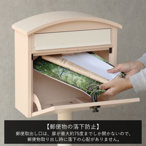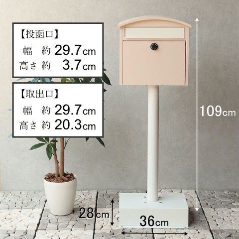 | 【スタンドタイプ】 置くだけで使用可能なスタンド式。壁掛け式とは異なり面倒な施工の手間がかかりません。 土台部は、標準サイズのレンガ(21×10×6cm)を最大3個入れることが可能です(横向き×2、縦向き×1)。 地面固定用のアンカーボルトが付属します。土台部にアンカーボルトを打ち込む穴があり、地面とポストを固定することも可能です。 【投函可能目安サイズ】 茶封筒角型2号が投函可能です。 【セキュリティー】 鍵付きなので防犯面に安心です。※ダイヤルロックはお客様で好きな番号へ変更はできません。 【錆びにくい加工】 ガルバナイズド処理を施している為、錆の発生がしにくい仕様となっております。 ※防水加工は施しておりませんので、軒下や屋根がある場所への設置を推奨致します。 【デザイン】 郵便取出口は、扉が最大約75°までにしか開かない構造なので、郵便取出し時に、郵便物落下の心配がありません。 天板はアール形状のデザインで仕上がっており、玄関先を明るく彩ります。 【カラー】 本体カラーは、玄関先を明るく彩る、ピンクベージュとブルーグレーで塗装仕上げされており、脚、台座、投函口は、ホワイトカラーで仕上がっております。 |