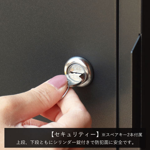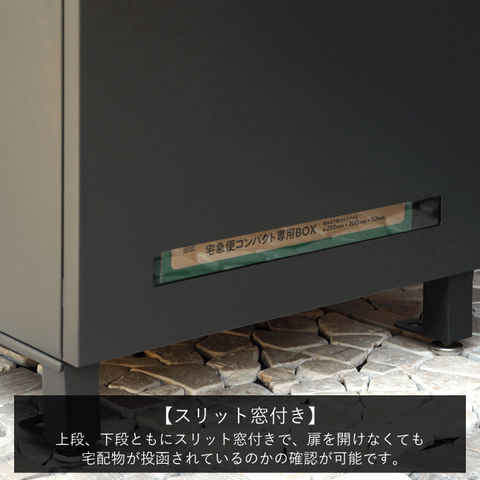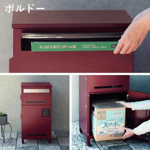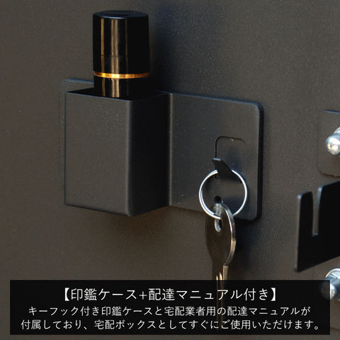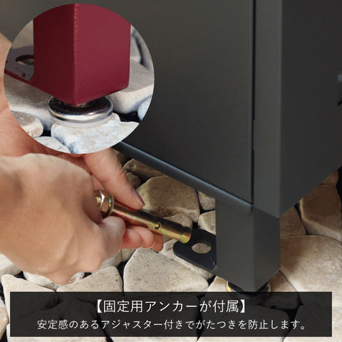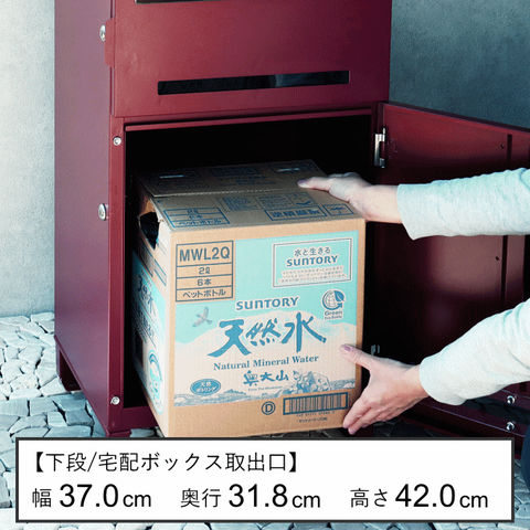 | 郵便物、宅配物どちらも不在時に、荷物を受け取れるポスト付き宅配ボックス。忙しいあなたや、配達の方にも優しい商品です。 高級感のある郵便受けが個性ある玄関を演出する宅配BOXです。 【セキュリティー】 上段、下段ともに、シリンダー錠付きで、防犯面に安全です。また、スペアキーが2本付属しています(上段、下段ともに)。 【スリット窓付き】 上段、下段ともにスリット窓付きで、扉を開けなくても宅配物が投函されているかの確認が可能です。 【印鑑ケース・配達マニュアル付き】 扉側に捺印用の印鑑ホルダーが付属(上段、下段ともに)。マグネット式で任意の場所に取り付けることが可能です。 ※印鑑はご自身でご用意ください。 配達マニュアルのメッセージマグネットが付属しています。任意でご使用ください。下部宅配ボックスの鍵は宅配業者施錠後、メールボックスへ入れてもらいます。 【デザイン】 扉にはマグネット付きで鍵を施錠しなくても勝手に開かないようになっています。 上段の郵便投函口は、ステンレス(SUS316)を使用しており、デザインにアクセントを付けております。 【錆びにくい加工】 ガルバナイズド処理を施している為、錆の発生がしにくい仕様となっております。 ※防水加工は施しておりませんので、軒下や屋根がある場所への設置を推奨致します。 【アンカーボルト付属】 脚部に地面固定用のアンカーボルト穴があり、地面と商品を固定することも可能です。 【簡易組立品】本体部は完成品で、取っ手・脚・アジャスターのみお客様取付の為、お手間を掛けずに商品をご使用いただけます。 |