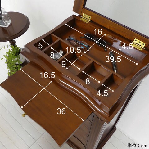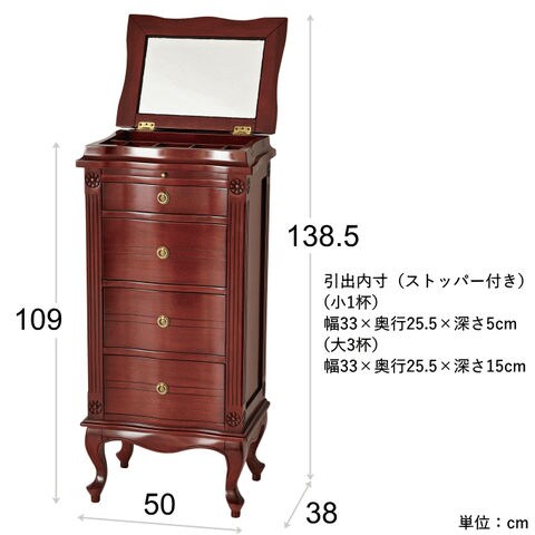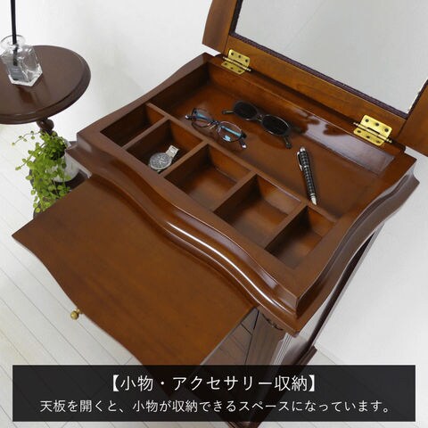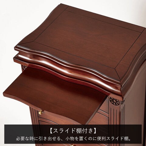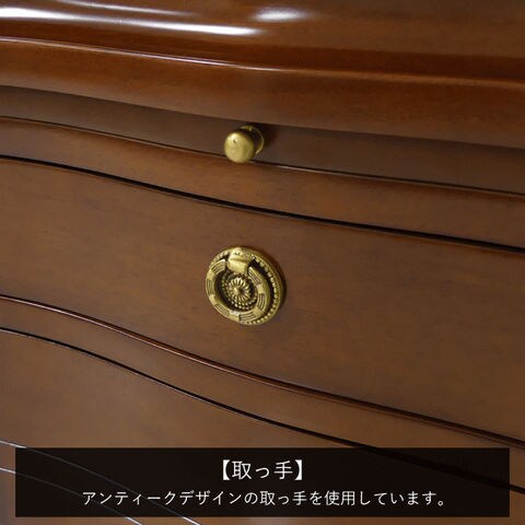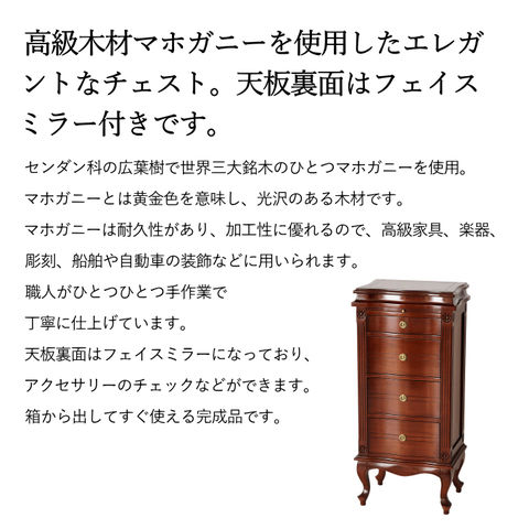 | 高級木材マホガニーを使用した贅沢な逸品。エレガントなチェスト。天板裏面はフェイスミラー付きです。 ・センダン科の広葉樹で世界三大銘木のひとつマホガニーを使用。マホガニーとは黄金色を意味し、光沢のある木材です。マホガニーは耐久性があり、加工性に優れるので、高級家具、楽器、彫刻、船舶や自動車の装飾などに用いられます。 ・職人がひとつひとつ手作業で丁寧に仕上げています。 ・天板裏面はフェイスミラー付きで、アクセサリーなどのチェックができます。 ・天板を開くと、内部は小物やアクセサリーが収納できるスペースになっています。 ・必要な時に引き出せるスライド棚付き。ちょっとしたものを置くのに便利です。 ・アンティーク調デザインの取っ手を使用しています。 ・滑らかな曲線が美しい優雅な猫脚、お洒落でクラシカルな印象です。 ・背面も化粧仕上げなので、どこから見ても美しく置く場所を選びません。 ・床のキズ付きを防止する脚裏シール付きです。 ・箱から出してすぐ使えるうれしい完成品です。 |