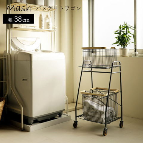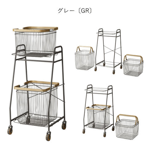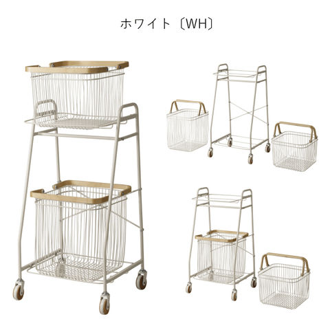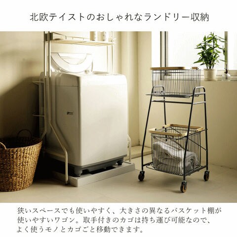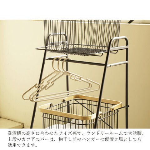 | 狭いスペースでも扱いやすく、大きさの異なるバスケット棚が使いやすいワゴン。 取手付きのカゴは持ち運び可能なので、よく使うものをカゴごと移動できます。 洗濯機の高さに合わせたサイズ感で、ランドリールームで活躍。 上段のカゴ下バーは、物干し前のハンガーの仮置き場としても活用できます。 |