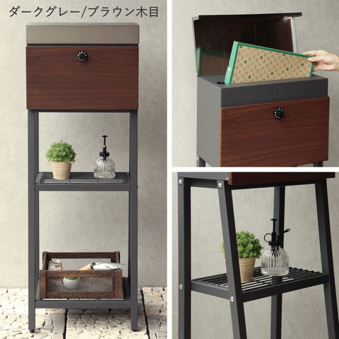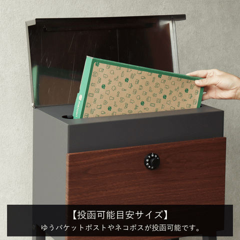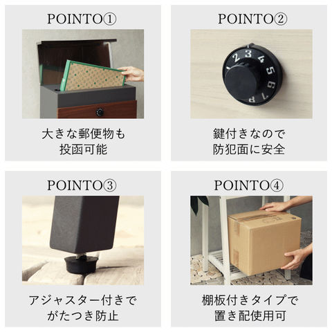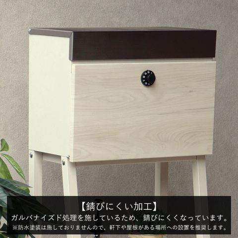 | 【スタンドタイプ】 置くだけで使用可能なスタンド式。壁掛け式とは異なり面倒な施工の手間がかかりません。 【投函可能目安サイズ】 レターパックライトやネコポスが投函可能です。 【セキュリティー】 鍵付きなので防犯面に安心です。 ※ダイヤルロックは好きな番号へ変更はできません。 ※ダイヤルロックは任意で2つ番号が与えられ3回ダイヤルを回して解錠する仕様です。 【棚板付き】 棚板付きタイプで、小さい荷物であれば、棚板を置き配用としてご使用いただけます。 棚板が2枚付きで、小物の装飾やガーデニングアイテムの収納として便利にご使用いただけます。 【デザイン】 郵便入れ本体の上蓋は、ステンレス素材で仕上げており、デザインのアクセントになっております。 脚部はアジャスター付きで、アジャスターの高さ調節で、設置場所のがたつき防止の役目を果たします。 【カラー】 本体カラーは、落ち着いた色目のダークグレー/ブラウン木目と、くすんだベージュ/ホワイト木目の2色からお選びいただけます。 【錆びにくい加工】 ガルバナイズド処理を施している為、錆の発生がしにくい仕様となっております。 ※防水加工は施しておりませんので、軒下や屋根がある場所への設置を推奨致します。 |
