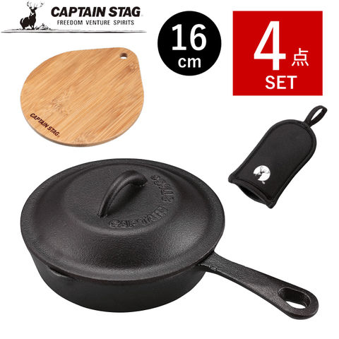 スキレット 16cm 4点セット 蓋付き スキレット蓋 カバー付き ミット スキレットカバー スキレットハンドルカバー スキレットプレート 鉄 フライパン グリルパン グリルプレート ふた 蓋 フタ キャンプ アウトドア クッカー UG-3027+3 キャプテンスタッグ