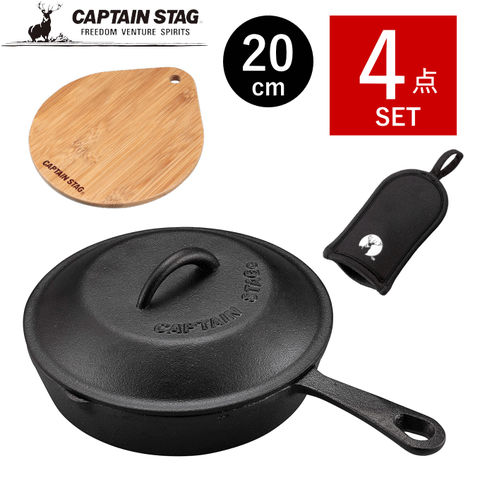 スキレット 20cm 4点セット 蓋付き スキレット蓋 カバー付き ミット スキレットカバー スキレットハンドルカバー スキレットプレート 鉄 フライパン グリルパン グリルプレート ふた 蓋 フタ キャンプ アウトドア クッカー UG-3028+3 キャプテンスタッグ