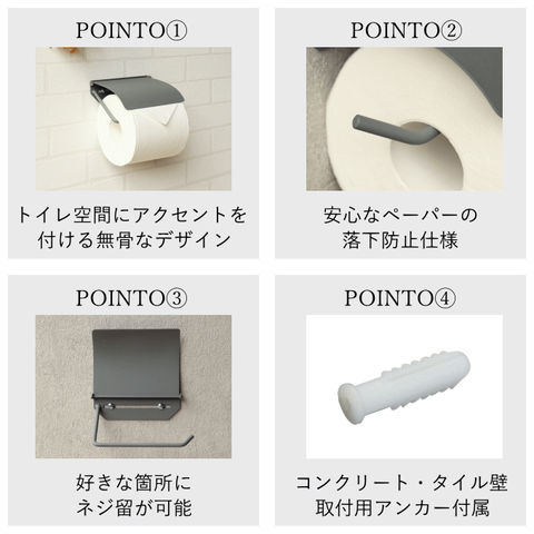 | 光沢を少し抑えたマットなアイアンで仕上げており、インテリア性の高いトイレ空間を彩るペーパーホルダーです。 【デザイン】 シンプルなデザインで、飽きのこないスタンダードなペーパーホルダーに仕上がっております。トイレットペーパー差込バーは、先端を少し曲げた仕様ですので、ペーパーの転落防止になります(JIS規格商品収納可能)。トイレットペーパーを支えるバー付きで、ペーパーを引っ張る際のストッパーの役目を果たします。アイアン部は粉体塗装で仕上げ、耐久性に優れひび割れや剥がれ、錆が発生しにくい仕様となります。 【設置場所】 商品の取付は約幅10cmの幅内であれば、好きな箇所にネジ留可能です。 コンクリート壁・タイル壁取付用のアンカーも付属しています。 ※石膏ボード壁の場合は、壁奥の下地(木柱やベニヤ板等)に、木ねじで固定をお願い致します。 |