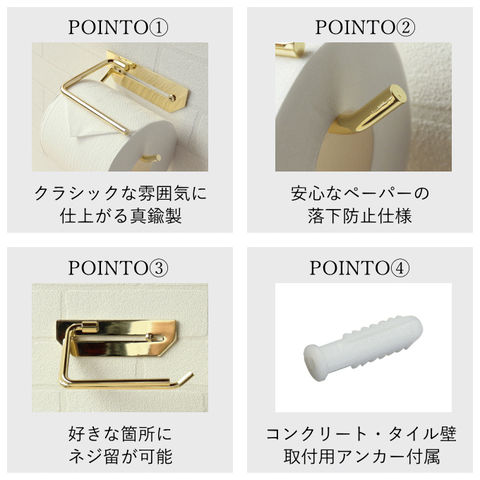 | 真鍮製のトイレットペーパーホルダーで、クラシックな雰囲気に仕上がっております。インテリア性の高いトイレ空間を彩るペーパーホルダーです。 【真鍮】 真鍮素材は、年を重ねるごとに黒い落ち着いた色目になり、風合いが増していきます。真鍮は耐食性に優れ、錆が発生しにくい特徴があります。 【デザイン】 シンプルなデザインで、飽きのこないスタンダードなペーパーホルダーに仕上がっております。トイレットペーパー差込バーは、先端を少し曲げた仕様ですので、ペーパーの転落防止になります(JIS規格商品収納可能)。トイレットペーパーを支えるバー付きで、ペーパーを引っ張る際のストッパーの役目を果たします。 【設置場所】 商品の取付は約幅10cmの幅内であれば、好きな箇所にネジ留可能です。 コンクリート壁・タイル壁取付用のアンカーも付属しています。 ※石膏ボード壁の場合は、壁奥の下地(木柱やベニヤ板等)に、木ねじで固定をお願い致します。 |