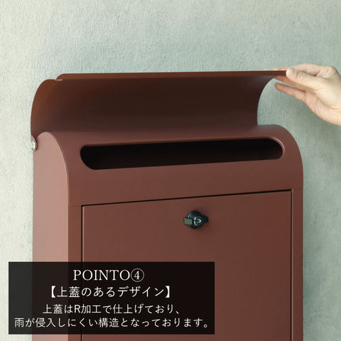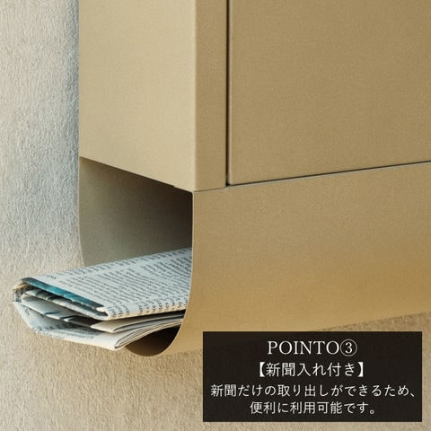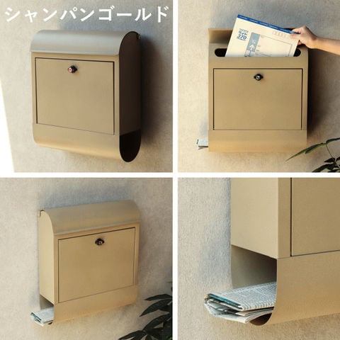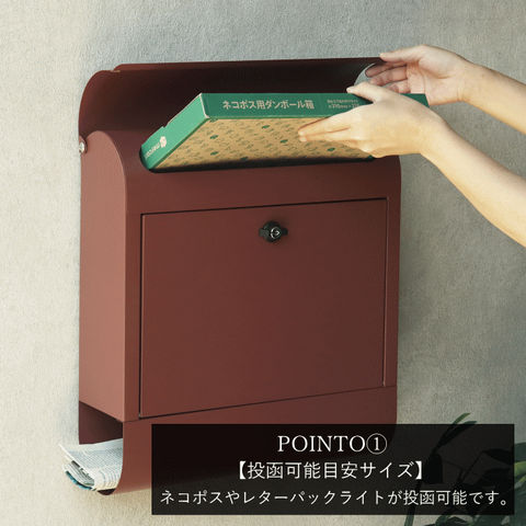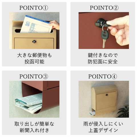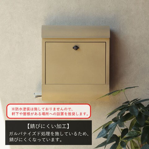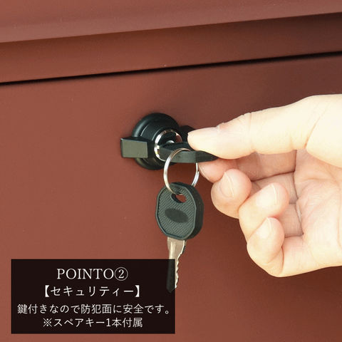 | 【投函可能目安サイズ】 レターパックライトやネコポスが投函可能です。 【セキュリティー】 鍵付きなので防犯面に安心です。 ※スペアキー1本付属 【新聞入れ付き】 新聞だけの取り出しができるため、便利に利用可能です。 【デザイン】 上蓋と新聞入れ部はR加工で仕上げており、統一感のある丸みのデザインで仕上がっております。 上蓋のあるデザインポストで、雨が侵入しにくい構造となっています。 【カラー】 本体カラーは、落ち着いた深みのあるカーディナルレッドと、華やかな色調のシャンパンゴールドの2色展開になります。 【錆びにくい加工】 ガルバナイズド処理を施している為、錆の発生がしにくい仕様となっております。 ※防水加工は施しておりませんので、軒下や屋根がある場所への設置を推奨致します。 |