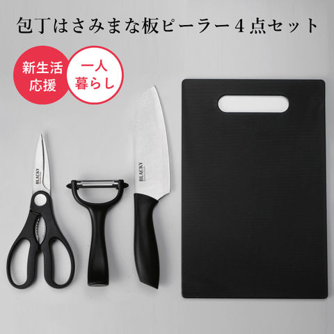 | 包丁・まな板・はさみ・ピーラーのキッチン用品4点セット。 |