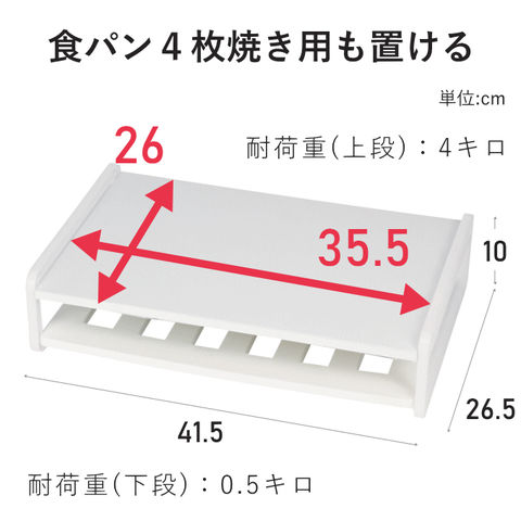 | トースター周りの小物をすっきり収納。 トースター下のデッドスペースを有効活用。 工具不要なので、組立も簡単です。 食パン4枚焼き用トースターも置けます。 【簡単組み立て】 《部品明細》 上段用棚・下段用棚・フレーム×2 《組立方法》 1.下段裏側にフレームを差し込む 2.フレームを付けた下段用棚を180度返す 3.フレームに上段を差し込む |