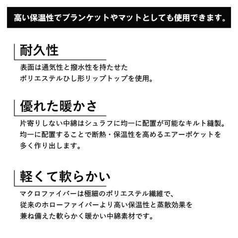 | 表地:ポリエステル100%、裏地:ポリエステル100%、中綿:ポリエステル100%(マイクロファイバー)200g、バッグ:ポリエステル |