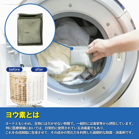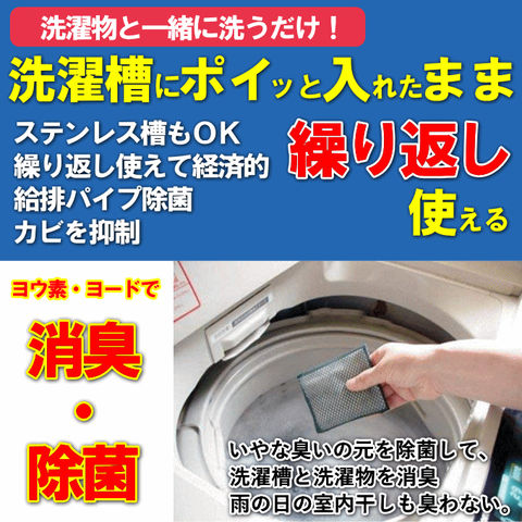 | 洗濯槽・洗濯機にポイっとするだけ! 洗濯槽・洗濯物の除菌・消臭! 繰り返し使えて経済的。 1日1回の使用で約3~4カ月使えます。 ステンレス槽もOK! ヨウ素とは ヨードともいわれ、傷口の消毒やのどの殺菌など日常的に使っている薬剤成分のひとつで、海草等に含まれる天然素材です。 |