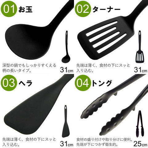| 新社会人や大学生など新生活を始める方・これから料理を始める方・調理道具を必要な分だけ欲しい方にオススメなキッチンツールセット。調理用サイズから卓上サイズまで幅広いラインナップです。 別売のシリコン製菜箸と揃えて調理器具をブラックに統一もできます。 ●66ナイロン製 ナイロン製なのでステンレス製のツールに比べフライパンやお鍋を傷付けません。 ●つなぎ目のない一体成型 部品が分かれていない一体成型なので、部品と部品の間に汚れがたまらず洗いやすいので衛生的に使用することができます。 ●用途は多岐に 耐熱温度は約210度。食洗機にも対応しており、炒め物などの高温調理にも使用可能です。 ※鉄のフライパンやお鍋は温度がかなり高くなるため、使用はお避け下さい。 |