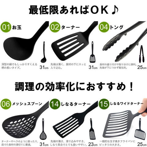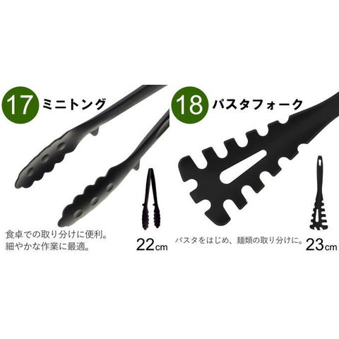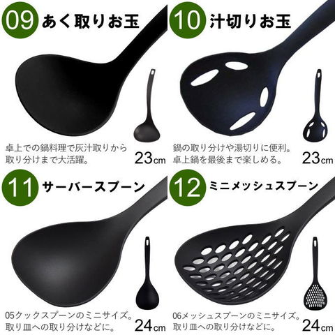 | ↓↓調理用サイズ↓↓全長(約)31cm (01)お玉 / 全長31cm×幅9cm / 62g (02)ターナー / 全長31cm×幅8cm / 52g (03)ヘラ / 全長31cm×幅7cm / 61g (04)トング / 全長25cm×幅8cm / 54g (05)クックスプーン / 全長31cm×幅10cm / 64g (06)メッシュスプーン / 全長31cm×幅10cm / 59g (07)しなるロングターナー / 全長31cm×幅6.5cm / 51g (08)中華ヘラ / 全長31cm×幅11.5cm / 73g ↓↓卓上(コンパクト)サイズ↓↓全長(約)23cm (09)あく取りお玉 / 全長23cm×幅7.5cm / 39g (10)汁きりお玉 / 全長23cm×幅7.5cm / 38g (11)サーバースプーン / 全長24cm×幅7.5cm / 38g (12)ミニメッシュスプーン / 全長24cm×幅7.5cm / 32g (13)ミニターナー / 全長23cm×幅7cm / 33g (14)しなるターナー / 全長23cm×幅5cm / 28g (15)しなるワイドターナー / 全長25cm×幅12.5cm / 37g (16)チャーハンしゃもじ / 全長23cm×幅6cm / 35g (17)ミニトング / 全長22cm×幅8cm / 35g (18)パスタフォーク / 全長23cm×幅6cm / 33g |