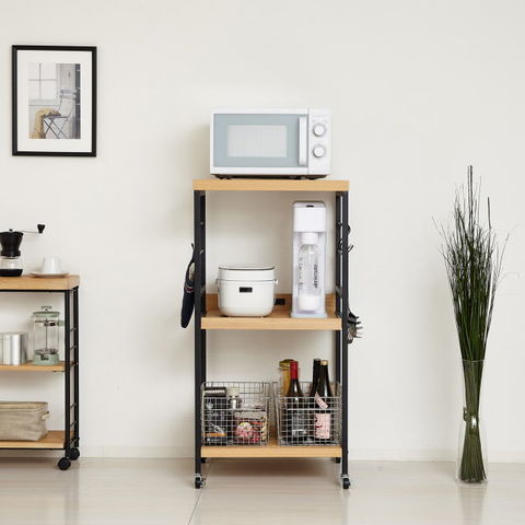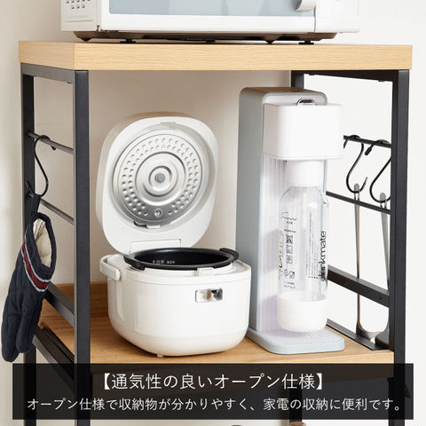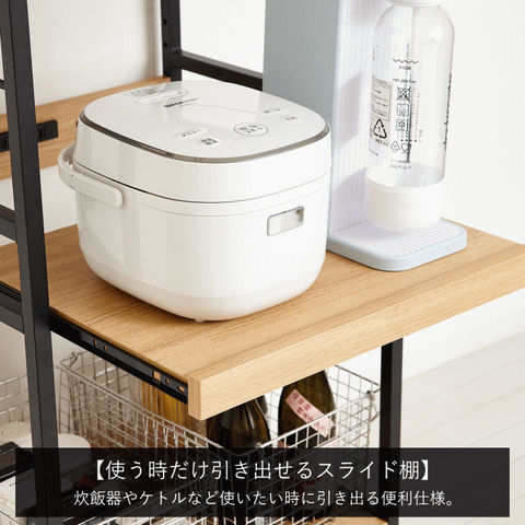 | ・キッチン家電をすっきり収納できるレンジ台です。 ・天板は凹凸のあるエンボス加工で高級感があり、合成樹脂なので傷がつきにくく、お手入れが簡単です。 ・収納物の高さに合わせてスライド棚の取付位置を2か所から選べます。 ・板厚は、天板約3.8cm、地板約3cmと重厚感があります。 ・使う時だけ引き出せるスライド棚は、炊飯器やケトルの使用に便利です。 ・家電の使用に必要な1500W2口コンセント付き。 ・フレームはスチール製でスタイリッシュな印象、キッチン小物を引っ掛けることもできます。 ・キャスターは4個付き(2個ストッパー付き)でお掃除の際の移動もらくらく。 ・通気性の高いオープンラック仕様で収納物が分かりやすく、キッチン家電の収納に便利です。 ・省スペースでコンパクトサイズ、一人暮らしの方にもおすすめです。 ・明るく爽やかなナチュラルとシックで落ち着きのあるブラウンの2色展開です。 |