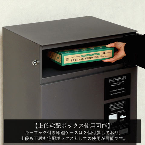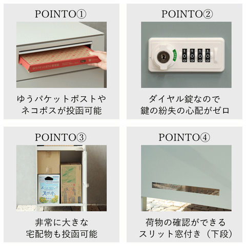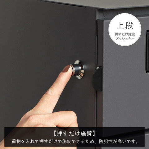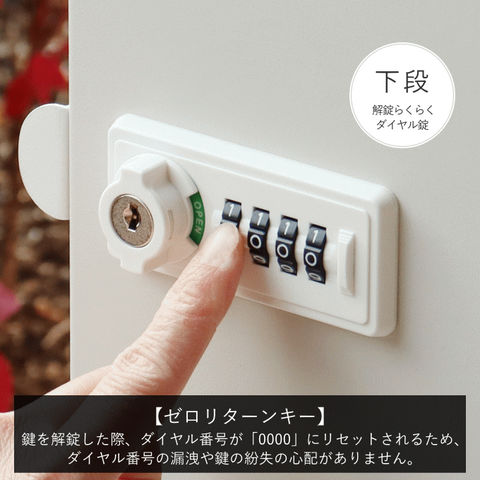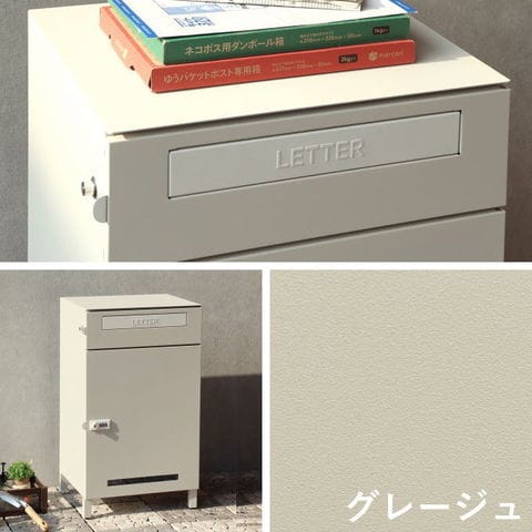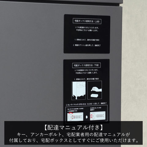 | 郵便物、宅配物どちらも不在時に、荷物を受け取れるポスト付き宅配ボックス。忙しいあなたや、配達の方にも優しい商品です。上段は押すだけで施錠できるプッシュ錠で防犯性が高いです。下段はダイヤルロックのゼロリターンキーで番号の漏洩や鍵の紛失の心配がありません。高級感のある郵便受けが個性ある玄関を演出する宅配BOXです。上段の郵便投函口は、ゆうパケットポストやレターパックライト、ネコポスが投函可能です。 【上段宅配使用可能】 印鑑ケースは2個付属しており、上段の鍵もプッシュキーを使用しているので、上段も宅配ボックスとしての使用も可能です。 【セキュリティー】 上段はプッシュキーで簡単に鍵の開閉が可能で、防犯面にも安心です。また、スペアキーが1本付属しております。 下段はダイヤルロックとシリンダー錠(ダイヤル解錠番号がわからなくなった際の緊急用)でドアの解錠が可能です。 ゼロリターンキー:下段のダイヤルロックは鍵を解錠した際にダイヤル番号が「0000」にリセットされ、設定したダイヤル番号の漏洩の心配がありません。 【スリット窓付き】 下段は正面扉下部にスリット窓付きで、扉を開けなくても荷物の確認が可能です。 【印鑑ケース・配達マニュアル付き】 扉側に捺印用の印鑑ホルダーが付属(上段、下段ともに)。マグネット式で任意の場所に取り付けることが可能です。※印鑑はご自身でご用意ください。 配達マニュアルのメッセージマグネットが付属しています。任意でご使用ください。 【デザイン】 扉にはマグネット付きで鍵を施錠しなくても勝手に開かないようになっています。 玄関を明るく彩るブルーグレーと、くすんだベージュのグレージュの2色よりお選びいただけます。投函口と取っ手はホワイト色でアクセントとなっています。 投函口には、LETTERの文字がエンボス加工で立体的に施されています。 【錆びにくい加工】 ガルバナイズド処理を施している為、錆の発生がしにくい仕様となっております。 ※防水加工は施しておりませんので、軒下や屋根がある場所への設置を推奨致します。 【アンカーボルト付属】 脚部に地面固定用のアンカーボルト穴があり、地面と商品を固定することも可能です。 【簡易組立品】本体部は完成品で、取っ手・脚・アジャスターのみお客様取付の為、お手間を掛けずに商品をご使用いただけます。 |
