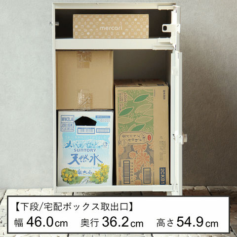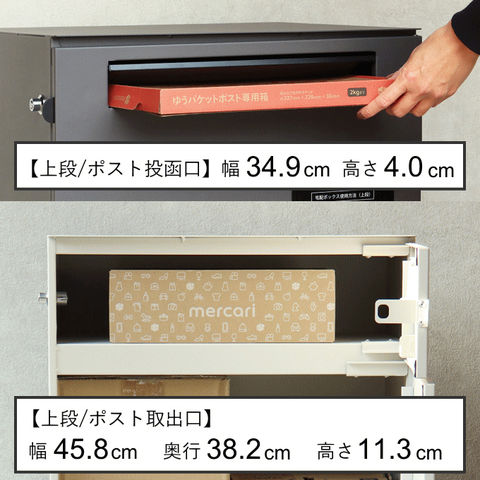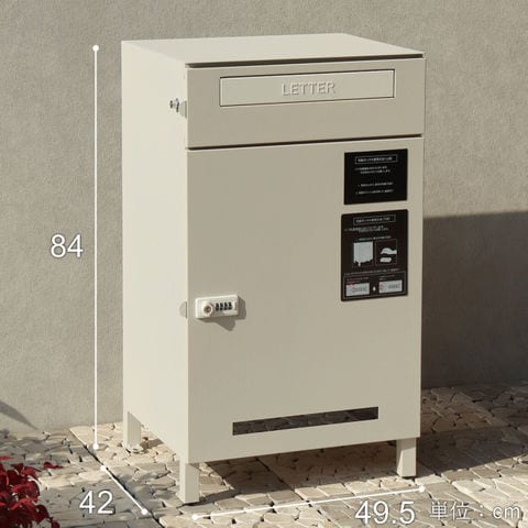 | 幅49.5(取っ手込みサイズ)×奥行42×高さ84(アジャスター込みサイズ)cm 【上段投函口】幅34.9×高さ4.0cm 【上段取出口】幅45.8×奥行38.2×高さ11.3cm 【下段宅配ボックス内寸】幅46.0×奥行36.2×高さ54.9cm |