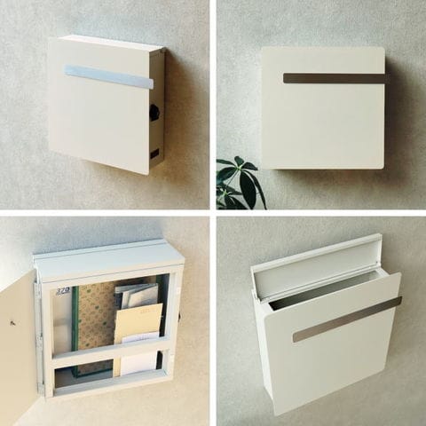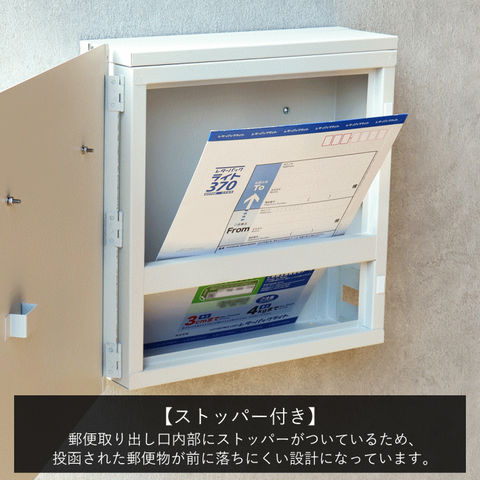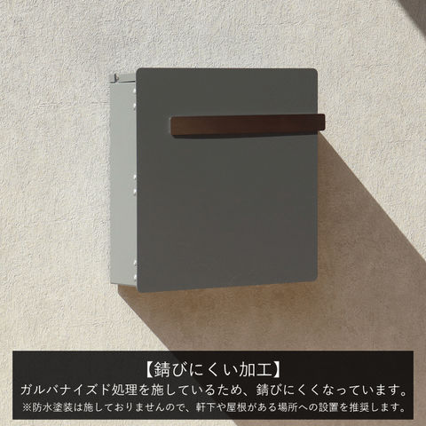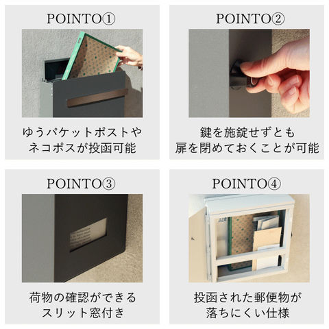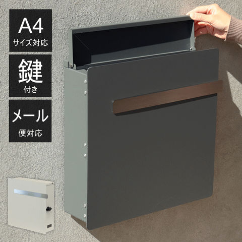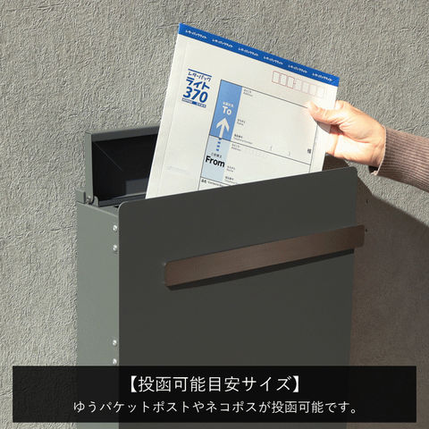 | 【投函可能目安サイズ】 ゆうパケットポストやネコポス、レターパックライトが投函可能です。 【セキュリティー】 鍵付きなので防犯面に安心です。※スペアキーが1本付属 ひねり錠タイプの鍵を使用しているので、鍵を施錠せずとも扉を閉めておくことが可能です。 【スリット窓付き】 向かって右側面にスリット窓付きで、扉を開けなくても荷物の確認が可能です。 【デザイン】 郵便取出し口内部にストッパーがついているため、投函された郵便物が前に落ちにくい設計になっています。 前扉は、ワンポイントのステンレス素材で仕上ており、デザインのアクセントになっています。 投函口部は、上蓋のあるデザインポストで、雨が侵入しにくい構造となっています。 【カラー】 本体カラーは、落ち着いた色合いのグレーと、くすんだベージュのグレージュの2色展開になります。 【錆びにくい加工】 ガルバナイズド処理を施している為、錆の発生がしにくい仕様となっております。 ※防水加工は施しておりませんので、軒下や屋根がある場所への設置を推奨致します。 |