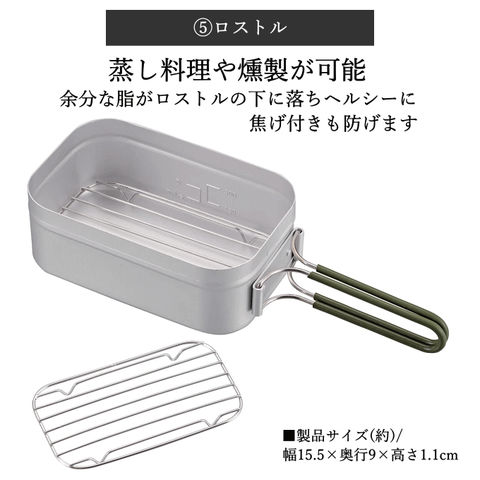 | 1合炊きのライスクッカー+ポケットストーブ+固形燃料+収納ケース+ロストル+カッティングボードの6点セット。 珍しい固形燃料付きのセットでご購入後すぐ使用することができます。 熱伝導性の高いアルミ製飯盒 食器やランチボックスとしても便利です。コンパクトストーブや小型ガスバーナーでご飯を炊くことができます。取っ手は折りたたみ可能。 ゴトクが2段階に開閉 シェラカップから角形クッカーまで幅広く使えます。 簡単着火でアウトドアで大活躍 コンパクトストーブの燃料としてではなく、炭の着火剤としても使用できます。 セット品がコンパクトに収納できるケース付 ライスクッカーがぴったり入るサイズです。内側には便利なメッシュポケット付き。 蒸し料理や燻製ができる 余分な脂がロストルの下に落ちヘルシーに。焦げ付きも防げます。 カッティングボードとしてだけでなく、鍋敷き、お皿、器としても。 ライスクッカーにピッタリ収納できるサイズ。 |