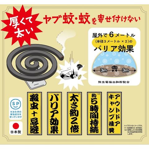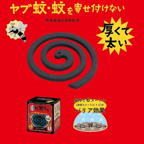 | 線香立て付、効能効果:蚊成虫の駆除又は忌避、用法及び容量:屋内(蚊成虫の駆除)、屋外(蚊成虫の忌避)で本品の1巻の一端に点火して燻煙する。特長:屋外で6メートル(半径3メートル×2)のバリア効果、約5時間持続、※環境により効果面積及び持続時間は変動します。 |
