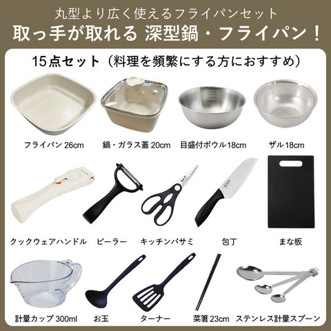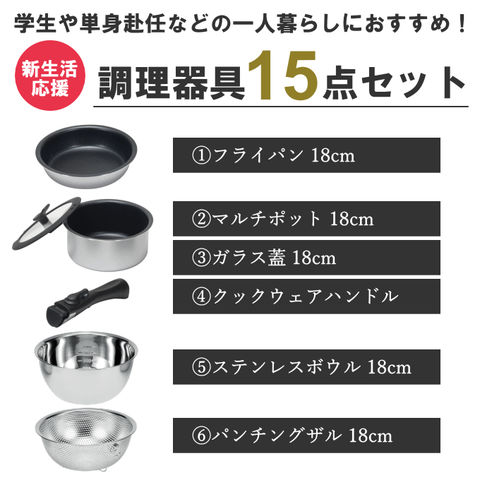 一人暮らし 調理器具 調理道具 セット キッチンセット キッチンツール 単身赴任 新生活 引っ越し おすすめ 鍋 18cm フライパン IH 対応 包丁 まな板 お玉 ターナー キッチンバサミ ボウル ザル ステンレス 菜箸 ピーラー 計量カップ 計量スプーン ギフト プレゼント 日本製 取っ手が取れる フライパンセット ガス火 深型 炒め鍋 ダイヤモンドコート マルチポット 片手鍋 なべ ナベ 蓋付き ガラス蓋付き 目盛付き パンチング ボール おたま オタマ ヘラ フライ返し はさみ ハサミ キッチン用品 ツールセット 調理 料理 キッチン ツール 道具 器具 一人暮らしセット 新生活応援