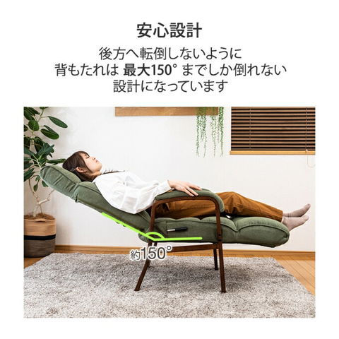| 【14段階で動くフットレスト】 14段階で上下に調節できるフットレスト。 フットレストを上げて背もたれを倒した全長はなんと146cm。 お昼寝にも快適です。むくみや疲れが出やすい脚を、ゆったりと持ち上げてくれるフットレスト。 これだけで、いつもの場所が至福のリラックスタイムに。 【膝に優しい座面高で立ち座り楽々!】 コンフォールは立ち座り最適な座面高38cm。 足腰への負担を軽減し、ストレスなく立ち座りいただけます。 【快適な操作性】 面倒なギア調節が、座ったまま手元のレバーを操作するだけで可能に。 ストレスなく背もたれを変えたい角度へ調節出来ちゃいます。 【ハイバックな背もたれ】 座面から背もたれトップまでの長さは70cm。 頭をしっかりと背もたれにあずける事が出来るうれしいハイバック。 頭が楽だと長時間座っても疲れません。 【ボリュームクッション】 少しでも長く使ってほしいから。 コンフォールは厳選したウレタンをたっぷりとクッション材に使用しています。 だから立体形状のしっかりとしたクッションが体を包み込むように支えてくれるのです。 |