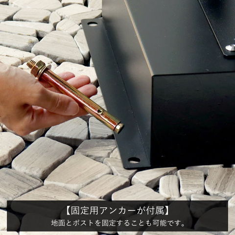 地面固定用のアンカーボルトが付属します。土台部にアンカーボルトを打ち込む穴があり、地面とポストを固定することも可能です。