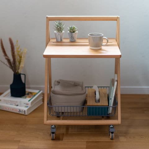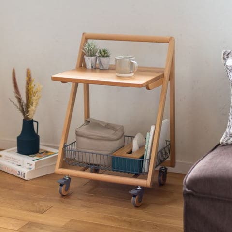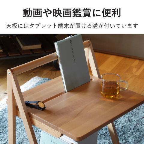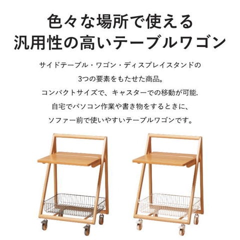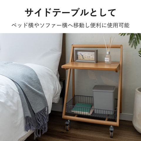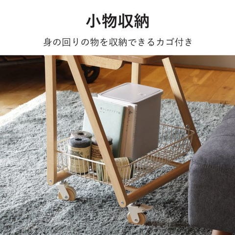 | 自宅でパソコン作業をするときに、ソファー前で使いやすいテーブルワゴンです。 サイドテーブル・ワゴン・ディスプレイスタンドの3つの要素を持たせた商品。コンパクトサイズで、キャスターでの移動が可能なので、色々な場所でお使いいただける汎用性の高い商品です。 キャスター付き(ストッパー付き2個)で移動が簡単なので、ソファ前だけでなく、ソファー横やベッド横へ移動し、サイドテーブル、ナイトテーブルとしても便利にご活用いただけます。 天板には、タブレット端末を立てることのできる溝がついており、動画や映画を見る際に便利に使えます。 ソファ前での使用時に、手元まで引き寄せても使いやすいA字型のフレーム設計。 身の回りの品を収納できるカゴが足元についているのもポイントです。 |