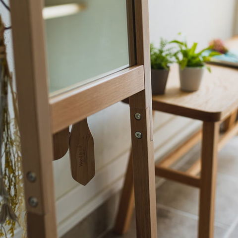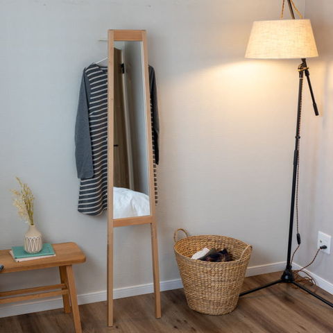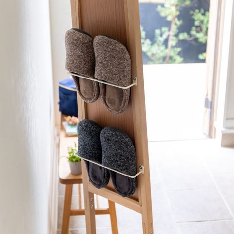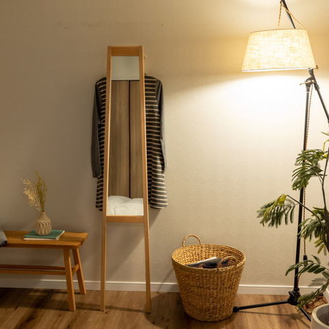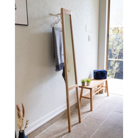 | 台形型にデザインされた天然木のフレームがお家にオブジェのように佇む立て掛けミラー。 立て掛けタイプにすることで奥行を抑えています。幅31cm、奥行30cmとスリムサイズで、玄関・リビング・寝室など限られたスペースにも多様なシーンで置きやすいミラーです。スリムサイズでありながらも足元まで見える設計。 ミラー背面に収納場所を設けたスチールバーは洋服やスリッパ、スプレーボトルのノズルを掛けるなどデッドスペースを活かした玄関周りの小物の収納ができます。 立て掛けるスチール部にはハンガー等が掛けられるので、玄関では上着やマフラーなどの収納、リビングやベッドルームでは、ストールやカーディガンなどの収納に最適です。 |