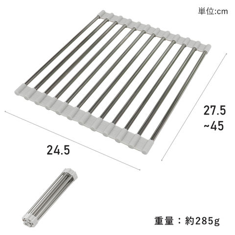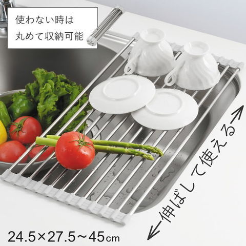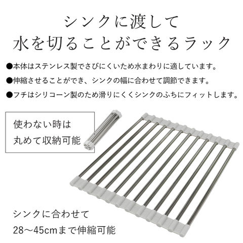 | シンクに渡して水を切ることができるラック。シンクに合わせて28~45cmまで伸縮可能。使わないときは丸めて収納可能。 ●本体はステンレス製でサビにくいため水まわりに適しています。 ●伸縮させることができ、シンクの幅に合わせて調節できます。 ●フチはシリコン製のため滑りにくくシンクのフチにフィットします。 |