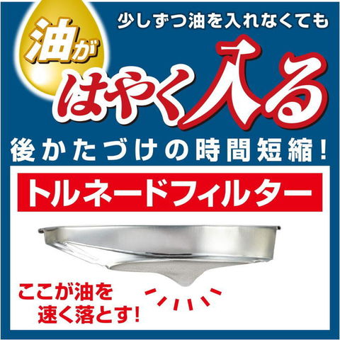 | 独自のトルネードフィルターで油が早く落ちる! 少しずつ油を入れなくてよいので、後片付けの時間を短縮。細かいメッシュで、油を綺麗に漉せます。 |
