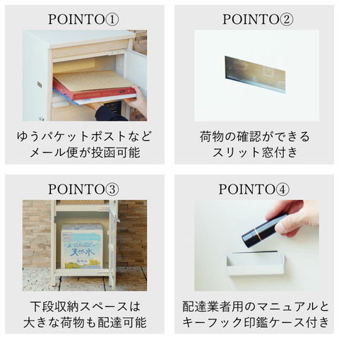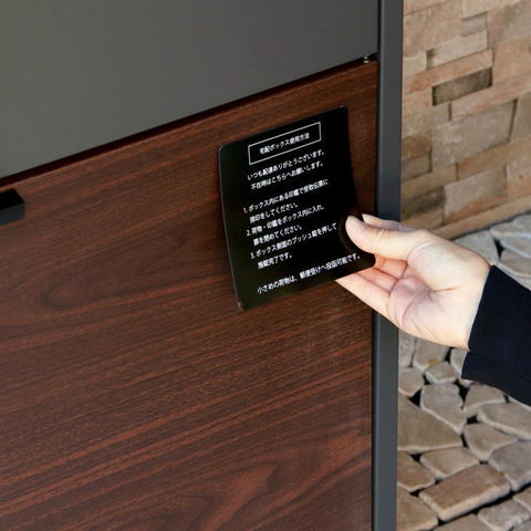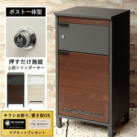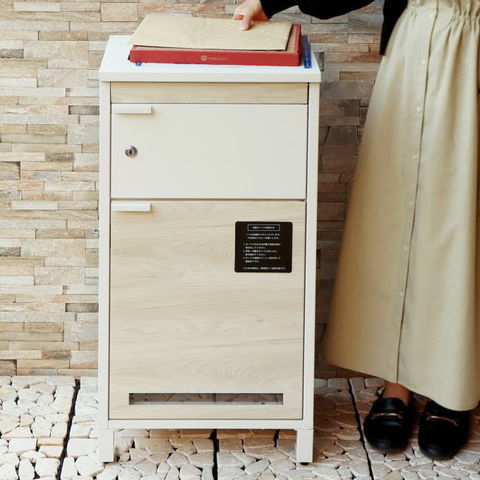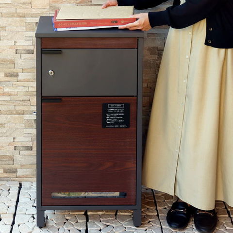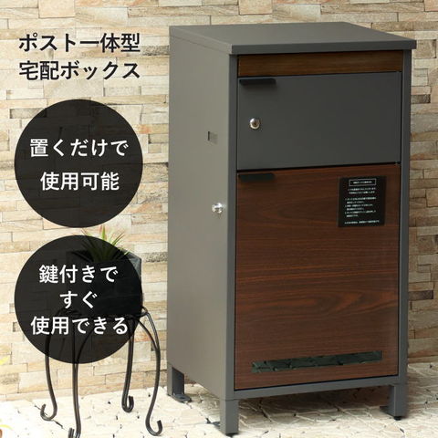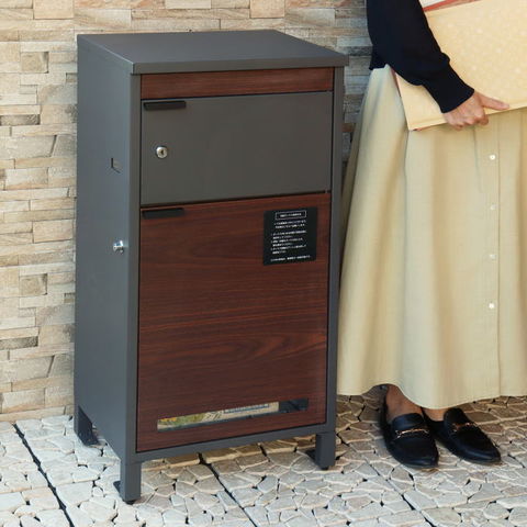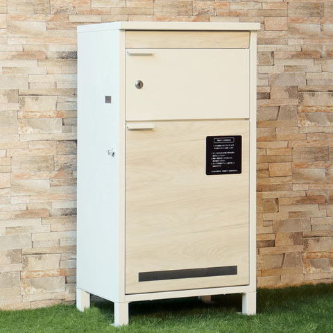 | 郵便物、宅配物どちらも不在時に、荷物を受け取れるポスト付き宅配ボックス。忙しいあなたや、配達の方にも優しい商品です。上段はシリンダーキーで防犯性が高いです。下段は押すだけで施錠できるプッシュ錠で防犯性が高いです。高級感のある郵便受けが個性ある玄関を演出する宅配BOXです。上段の郵便投函口は、ゆうパケットポストやレターパックライトが投函可能です。 【上段宅配BOX使用可能】 印鑑ケースは2個付属しており、上段の鍵もプッシュキーを使用しているので、上段も宅配ボックスとしての使用も可能です。 【セキュリティー】 上段はシリンダーキーで、防犯面にも安心です。また、スペアキーが1本付属しております。 下段は押すだけで施錠できるプッシュ錠で簡単に扉の開閉ができます。 【スリット窓付き】 上段は向かって左側面にスリット窓付きで、下段は正面扉下部にスリット窓付きで扉を開けなくても荷物の確認が可能です。 【印鑑ケース・配達マニュアル付き】 扉側に捺印用の印鑑ホルダーが付属(上段、下段ともに)。マグネット式で任意の場所に取り付けることが可能です。※印鑑はご自身でご用意ください。 配達マニュアルのメッセージマグネットが付属しています。任意でご使用ください。 【デザイン】 扉にはマグネット付きで鍵を施錠しなくても勝手に開かないようになっています。 上段、下段共に扉部に取っ手付きで、扉の開け閉めを楽に行っていただけます。 落ち着いたダークグレー色とブラウン木目の組み合わせ、お家の外壁に合わせやすいホワイト色とホワイト木目の2色からお選びいただけます。 【錆びにくい加工】 ガルバナイズド処理を施している為、錆の発生がしにくい仕様となっております。 ※防水加工は施しておりませんので、軒下や屋根がある場所への設置を推奨致します。 【アンカーボルト付属】 脚部に地面固定用のアンカーボルト穴があり、地面と商品を固定することも可能です。 【簡易組立品】本体部は完成品で、取っ手・脚・アジャスターのみお客様取付の為、お手間を掛けずに商品をご使用いただけます。 |