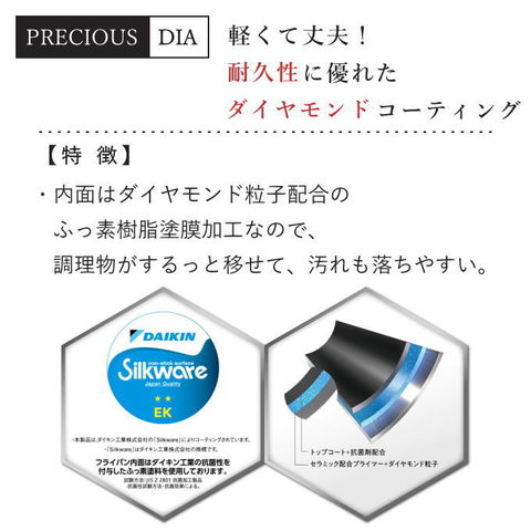 | 軽くて丈夫!耐久性に優れたダイヤモンドコーティング。 食材がつるんとくっつきにくい!ひと拭きでお手入れも簡単。 ・底とフチは厚く、側面が薄い、合理的肉厚軽量構造。 ・内面はダイヤモンド粒子配合のふっ素樹脂塗膜加工なので、調理物がツルッと移せて、汚れも落ちやすい。 ・外面はみがき仕上で、高級感あり。 ・手になじみ、使いやすいアップハンドルを採用。 ・ガス火はもちろん、200VのIHクッキングヒーターやハロゲンヒーターなどオール熱源に対応 鍋の内面は、ダイキン工業株式会社「Silkware」によりコーティングされています。※「Silkware」はダイキン工業株式会社の商標です。 ダイヤモンドコートで、こびりつきにくく、お手入れ簡単! ※フランジ加工により強度がアップしました。 |