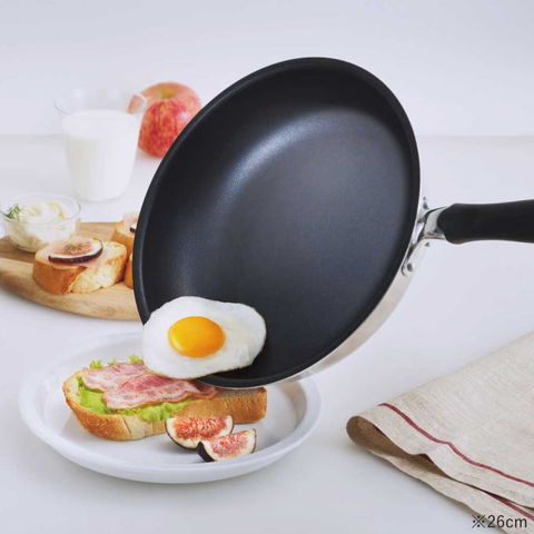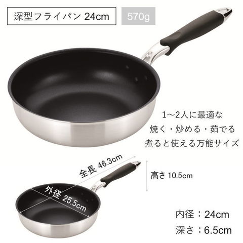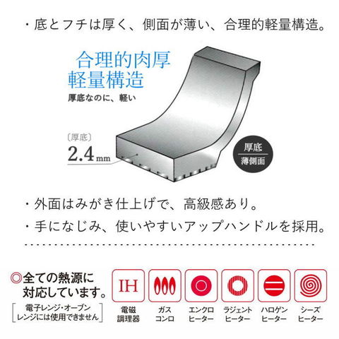 | 本体:アルミニウム合金(底厚2.4mm)、はり底:ステンレス鋼、ハンドル:フェノール樹脂(耐熱温度140度) 表面加工/内面:フッ素樹脂塗膜加工(ダイヤモンド粒子配合)、外面:サテン磨き |