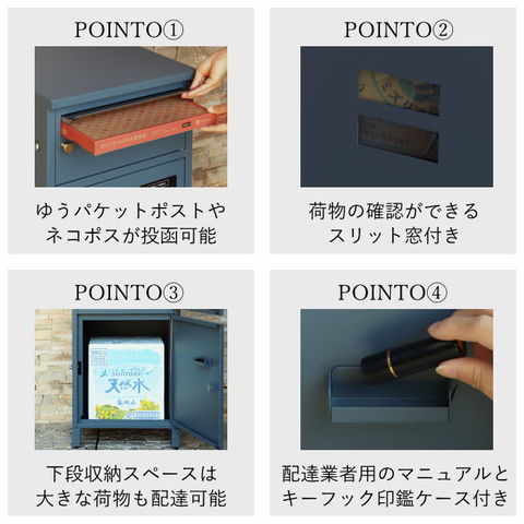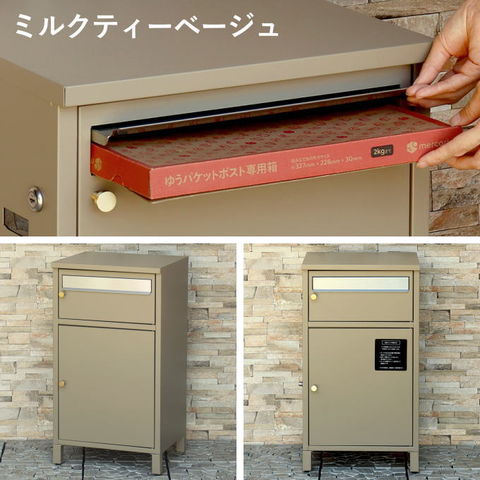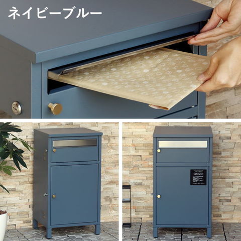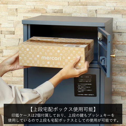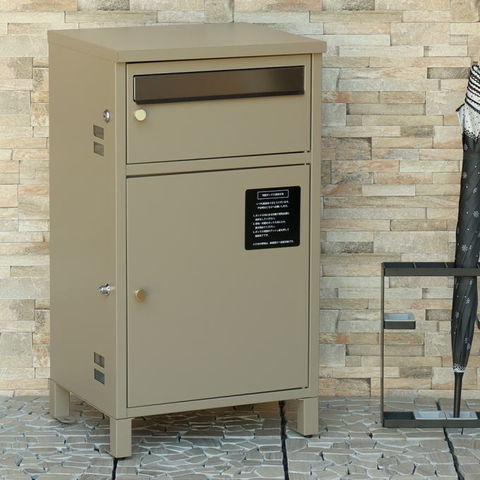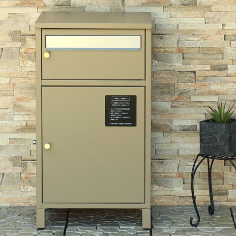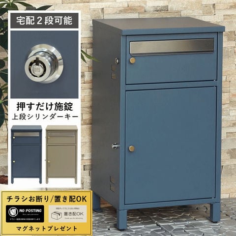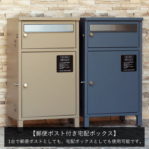 | 郵便物、宅配物どちらも不在時に、荷物を受け取れるポスト付き宅配ボックス。忙しいあなたや、配達の方にも優しい商品です。上段はシリンダーキーで防犯性が高いです。下段は押すだけで施錠できるプッシュ錠で防犯性が高いです。高級感のある郵便受けが個性ある玄関を演出する宅配BOXです。上段の郵便投函口は、ゆうパケットポストやレターパックライトなどメール便が投函可能です。 【上段宅配BOX使用可能】 印鑑ケースは2個付属しており、上段の鍵もプッシュキーを使用しているので、上段も宅配ボックスとしての使用も可能です。 【セキュリティー】 上段はシリンダーキーで、防犯面にも安心です。また、スペアキーが1本付属しております。 下段は押すだけで施錠できるプッシュ錠で簡単に扉の開閉ができます。 【スリット窓付き】 上段、下段共には向かって左側面にスリット窓付きでで扉を開けなくても荷物の確認が可能です。 【印鑑ケース・配達マニュアル付き】 扉側に捺印用の印鑑ホルダーが付属(上段、下段ともに)。マグネット式で任意の場所に取り付けることが可能です。※印鑑はご自身でご用意ください。 配達マニュアルのメッセージマグネットが付属しています。任意でご使用ください。 【デザイン】 扉にはマグネット付きで鍵を施錠しなくても勝手に開かないようになっています。 上段、下段共に扉部に取っ手付きで、扉の開け閉めを楽に行っていただけます。真鍮製の取っ手を使用しており、カジュアルかつレトロな雰囲気を演出しています。 深みのある落ち着いたネイビーブルーと、上品かつカジュアルな仕上がりのミルクティーベージュの2色からお選びいただけます。 【錆びにくい加工】 ガルバナイズド処理を施している為、錆の発生がしにくい仕様となっております。 ※防水加工は施しておりませんので、軒下や屋根がある場所への設置を推奨致します。 【アンカーボルト付属】 脚部に地面固定用のアンカーボルト穴があり、地面と商品を固定することも可能です。 【簡易組立品】本体部は完成品で、取っ手・脚・アジャスターのみお客様取付の為、お手間を掛けずに商品をご使用いただけます。 |