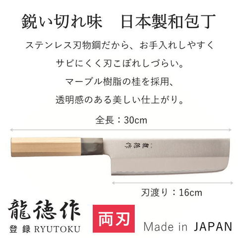 | 登録 龍徳作 RYUTOKU 鋭い切れ味 日本製和包丁 ステンレス刃物鋼だから、お手入れしやすく錆びにくく刃こぼれしづらい。 マーブル樹脂の桂を採用、透明感のある美しい仕上がり。 八角柄で滑りにくく、手のひらにフィットします。 |