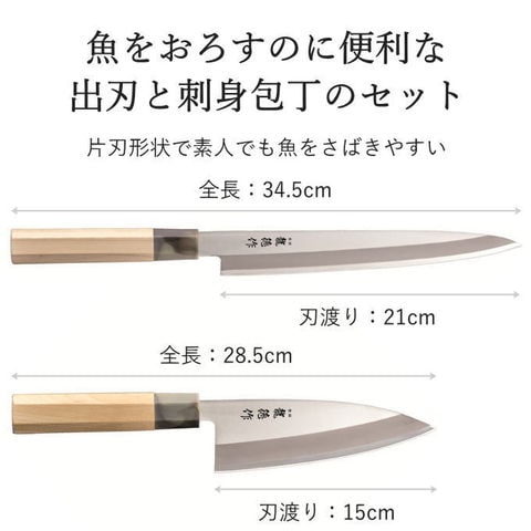 | 出刃包丁:全長28.5cm/刃渡り:15cm 刺身包丁:全長34.5cm/刃渡り:21cm |