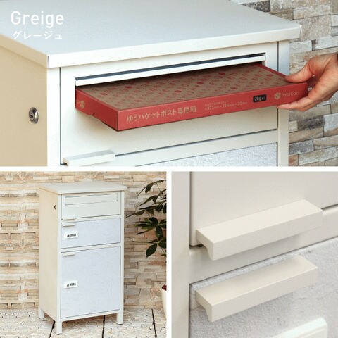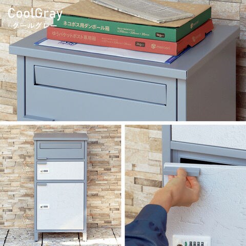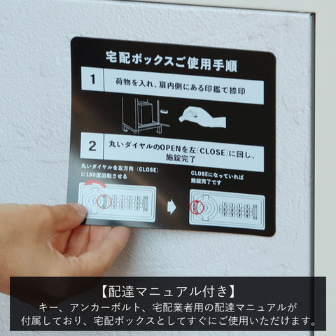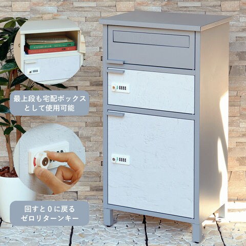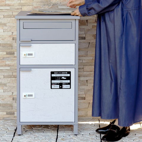 | 郵便物、宅配物どちらも不在時に、荷物を受け取れるポスト付き宅配ボックス又はポスト一体型宅配ボックス。忙しいあなたや、配達の方にも優しい商品です。 ダイヤルロックとシリンダー錠(ダイヤル解錠番号が分からなくなった際の緊急用)の組み合わせタイプの鍵を使用しており防犯性が高いです。 高級感のある郵便受けが個性ある玄関を演出する宅配BOXです。 【セキュリティー】 最上段は、シリンダー錠付きなので、防犯面に安心です。また、スペアキーが1本付属しております。 中段・下段のダイアルロックは、鍵を施錠した際、鍵を解錠した際にダイアル番号が0000にリセットされ、ダイヤル番号の漏洩の心配がありません。 【複数投函可能】 宅配専用扉が2段あるので、1日に2度商品の配達がある際も対応可能です。 【上段宅配ボックス使用可】 扉側に捺印用の印鑑ホルダーが3個付属しており、上段も宅配ボックスとしての使用が可能です。マグネット式で任意の場所に取り付けることが可能です。※印鑑はご自身でご用意ください。 上段の投函口は大きなサイズ設計で、ネコポスやゆうパケットポストが投函可能です。 【配達マニュアル付き】 キー(3段すべて)、アンカーボルト、キーフック付印鑑ケース、宅配業者用の配達マニュアル(マグネット式でお好きな場所に貼付け可)が付属しており、お客様で追加でご用意 頂くものは特に必要なく、すぐにご使用頂けます。 【デザイン】 カラーは、明るいグレーのクールグレーと、くすんだベージュのグレージュの2色からお選び頂けます。 宅配上段、宅配下段扉にはホワイトの漆喰風シートを使用しており、特徴のある仕上がりとなっおります(漆喰風シートの為、表面の凹凸はありません)。 【錆びにくい加工】 ガルバナイズド処理を施している為、錆の発生がしにくい仕様となっております。 ※防水加工は施しておりませんので、軒下や屋根がある場所への設置を推奨致します。 【アンカーボルト付属】 脚部に地面固定用のアンカーボルト穴があり、地面と商品を固定することも可能です。 |