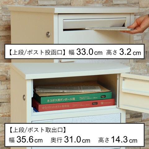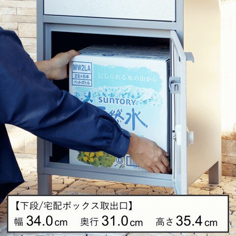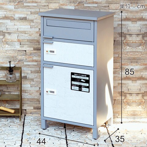 | 幅44×奥行35×高さ85(アジャスター込みサイズ)cm 【上段投函口】幅33.0×高さ3.2cm 【上段取出口】幅35.6×奥行31.0×高さ14.3cm 【宅配中段(内寸)】幅34.0×奥行31.0×高さ11.9cm 【宅配下段(内寸)】幅34.0×奥行31.0×高さ35.4cm |