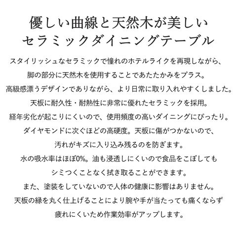 | 天板:セラミック、天然木化粧合板(アッシュ) 木部:天然木(アッシュ) 木部:ウレタン樹脂塗装 |