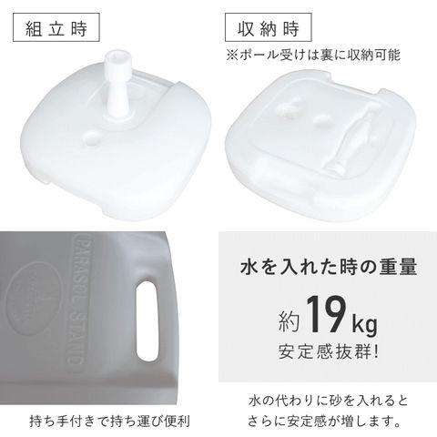 | ・ベーススタンド:パラソルのポール外径:φ19mm~φ35mmまで使用可能、水を入れた時の重量(約):19kg、容量17.5L |