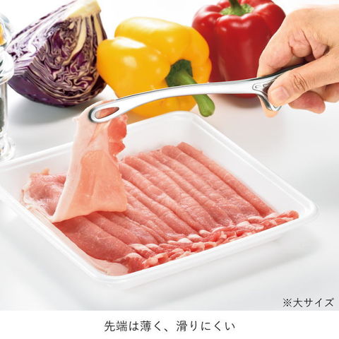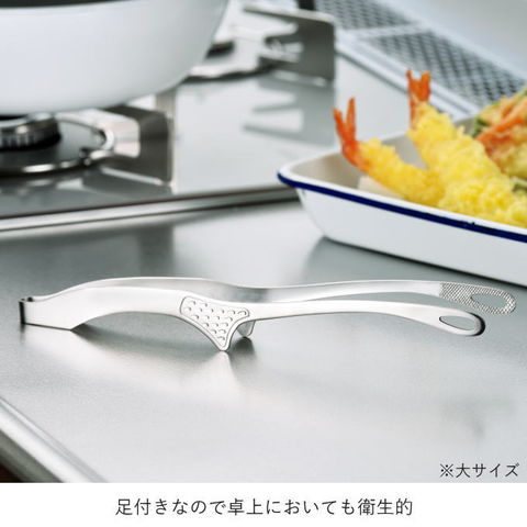 | Made in TSUBAME 燕三条 足付きなので卓上においても衛生的!先端は薄く、滑りにくい。ギザ加工で食材が掴みやすい!食洗機OK! |