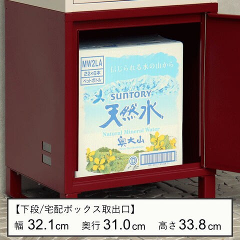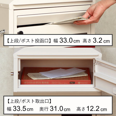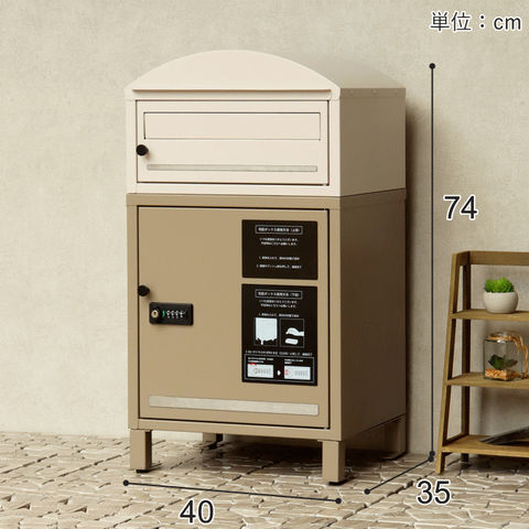 | 幅40×奥行35(取っ手込みサイズ)×高さ74(アジャスター込みサイズ)cm 【上段投函口】幅33.0×高さ3.2cm 【上段取出口】幅33.5×奥行31.0×高さ12.2cm 【宅配下段(内寸)】幅32.1×奥行31.0×高さ33.8cm |