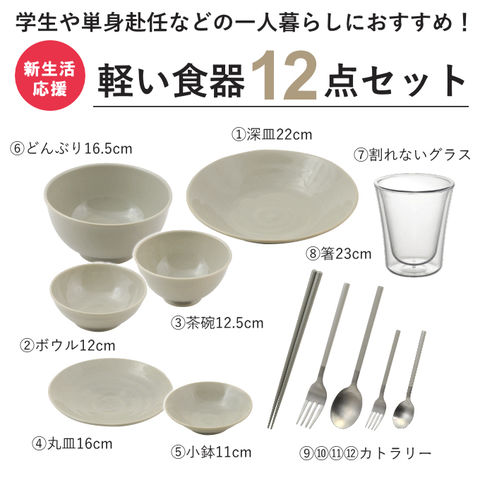 | 深皿22cm、ボウル12cm、茶碗12.5cm、丸皿16cm、小鉢11cm、どんぶり16.5cm、割れないグラス、箸・カトラリー5点 |