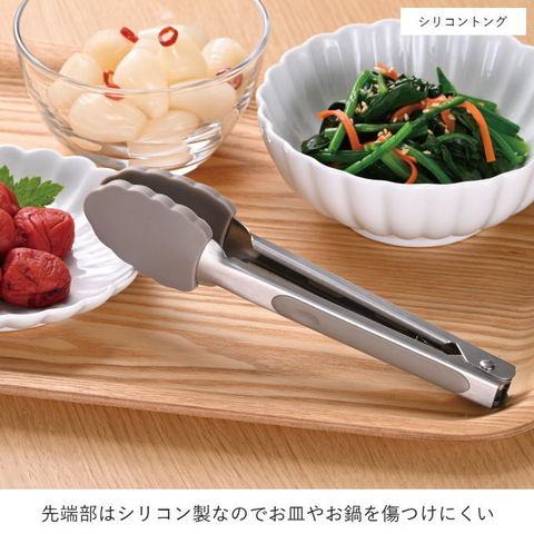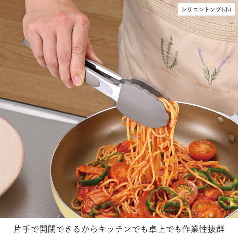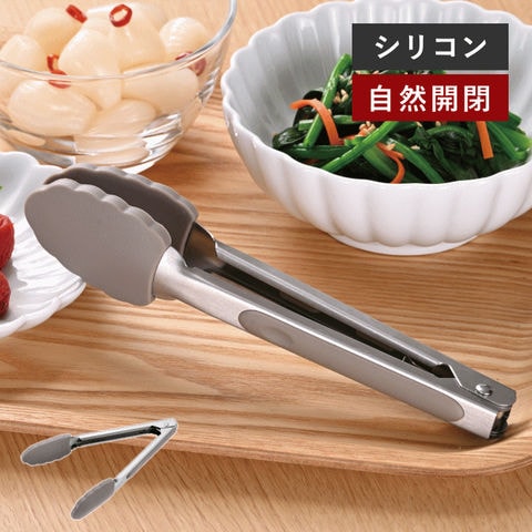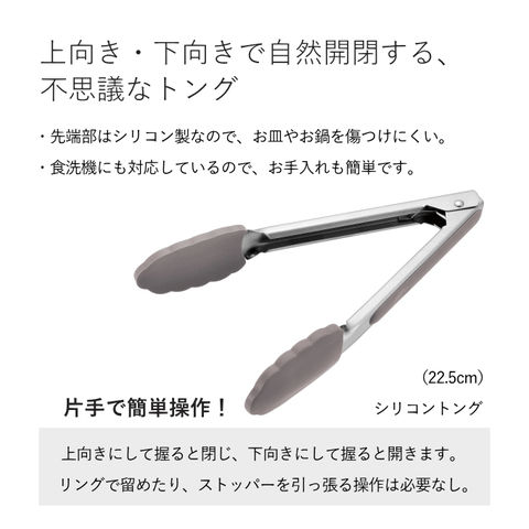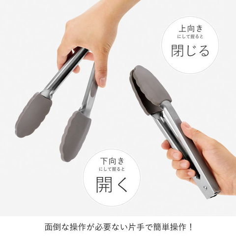 | 上向き・下向きで自然開閉する、不思議なトング。 ・片手で簡単に開閉できるから、キッチンでも卓上でも作業性抜群! ・先端部はシリコン製なので、お皿やお鍋を傷つけにくい。 ・食洗機対応なので、お手入れ簡単です。 片手で簡単操作! 上向きにして握ると閉じたままになり、下向きにして握るとと開いたままになります。リングで留めたり、ストッパーを引っ張ったり、面倒な操作が必要なし。 |