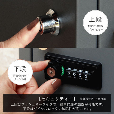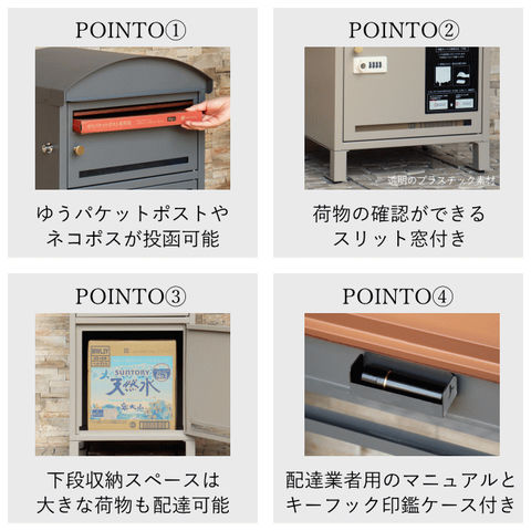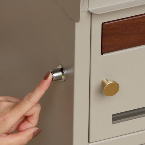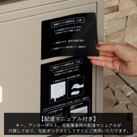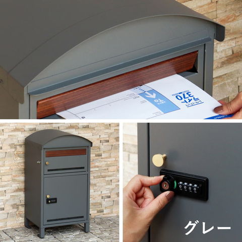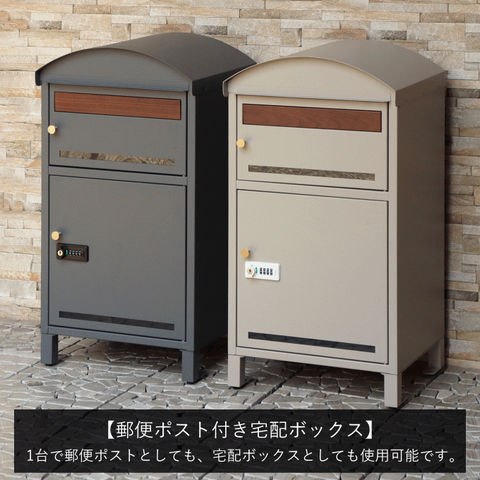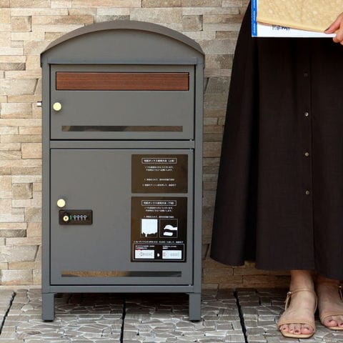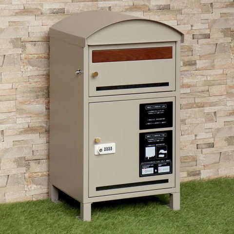 | 郵便物、宅配物どちらも不在時に、荷物を受け取れるポスト付き宅配ボックス又はポスト一体型宅配ボックス。忙しいあなたや、配達の方にも優しい商品です。 ダイヤルロックとシリンダー錠(ダイヤル解錠番号が分からなくなった際の緊急用)の組み合わせタイプの鍵を使用しており防犯性が高いです。 高級感のある郵便受けが個性ある玄関を演出する宅配BOXです。 【セキュリティー】 上段は、プッシュキーで簡単に鍵の開閉が可能で、防犯面にも安心です。また、スペアキーが1本付属しております。 下段のダイヤルロックは、鍵を施錠した際、鍵を解錠した際にダイヤル番号が「0000」にリセットされ、設定したダイヤル番号の漏洩の心配がありません。 【上段宅配ボックス使用可】 扉側に捺印用の印鑑ホルダーが2個付属しており、上段も宅配ボックスとしての使用が可能です。マグネット式で任意の場所に取り付けることが可能です。※印鑑はご自身でご用意ください。 上段の投函口は大きなサイズ設計で、ネコポスやゆうパケットポストが投函可能です。 【配達マニュアル付き】 キー(2段すべて)、アンカーボルト、キーフック付印鑑ケース、宅配業者用の配達マニュアル(マグネット式でお好きな場所に貼付け可)が付属しており、お客様で追加でご用意 頂くものは特に必要なく、すぐにご使用頂けます。 【デザイン】 落ち着いた色合いのグレーと上品な仕上がりのライトベージュからお選び頂けます。 真鍮製の取っ手を使用しており、カジュアルかつレトロな雰囲気を演出しております。 投函口部はブラウンの木目調で仕上げており、デザインのアクセントになっております。 【錆びにくい加工】 ガルバナイズド処理を施している為、錆の発生がしにくい仕様となっております。 ※防水加工は施しておりませんので、軒下や屋根がある場所への設置を推奨致します。 【アンカーボルト付属】 脚部に地面固定用のアンカーボルト穴があり、地面と商品を固定することも可能です。 |