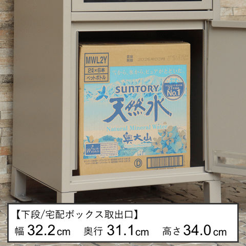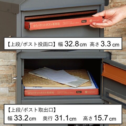| 幅40.6×奥行35×高さ76cm 【上段投函口】幅32.8×高さ3.3cm 【上段取出口】幅33.2×奥行31.1×高さ15.7cm 【宅配下段(内寸)】幅32.2×奥行31.1×高さ34.0cm |